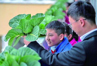 浙江丽水市莲都区高溪小学的学生在老师的带领下,在教学楼走廊上观察成熟的蔬菜及根须。新华社发