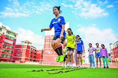 在江西都昌县第三小学,学生在教师的指导下开展足球训练。傅建斌摄/光明图片