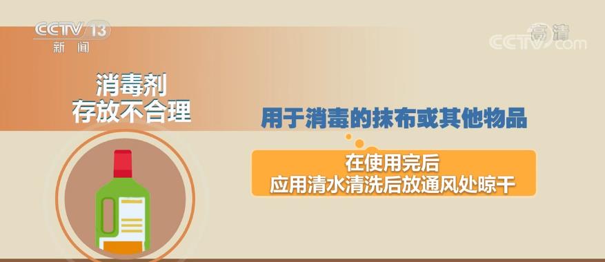 化学消毒剂多属易燃、易爆、易腐蚀性物品,存放和使用过程中应注意安全。存放消毒剂的容器必须有封闭盖子。应放置于避光、避热的阴凉处,确保儿童不易触及。用于消毒的抹布或者其他物品,在使用完后应用清水清洗后放通风处晾干。