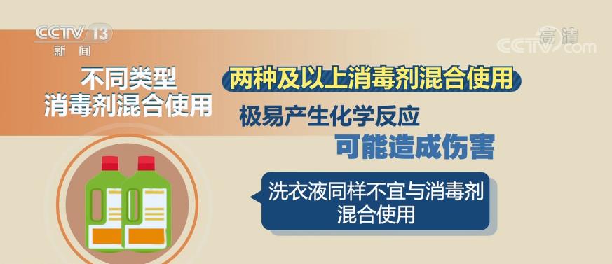 两种及以上消毒剂混合使用,极易产生化学反应,可能造成伤害。洗衣液同样不宜与消毒剂混合使用。
