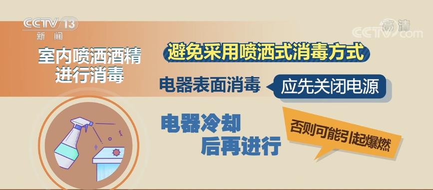室内使用酒精时,要避免采用喷洒式消毒方式。电器表面消毒,应先关闭电源,待电器冷却后再进行,否则可能引起爆燃。