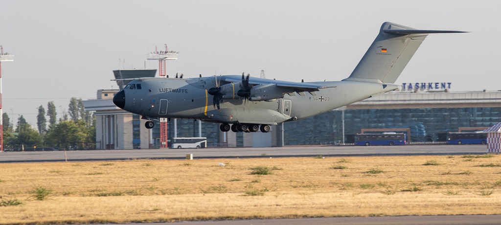 △一架德国联邦国防军运输机降落在乌兹别克斯坦首都塔什干(图片来源:德国联邦国防部)