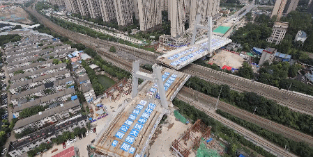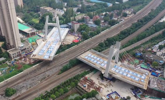 8月17日、18日,湖北武汉建安街上跨京广铁路高架桥两次转体后实现合龙。该工程为三跨钢箱梁斜拉桥,全长 519.3米,其中主桥全长245米,采用高低塔钢箱梁斜拉桥上跨铁路布置形式,桥面宽35.2米。