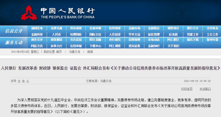 据中国人民银行官网消息,人民银行、发展改革委、财政部、银保监会、证监会、外汇局近日联合发文,从完善法制、推动发行交易管理分类趋同、提升信息披露有效性等十个方面,对推动公司信用类债券市场改革开放和高质量发展提出了具体意见。