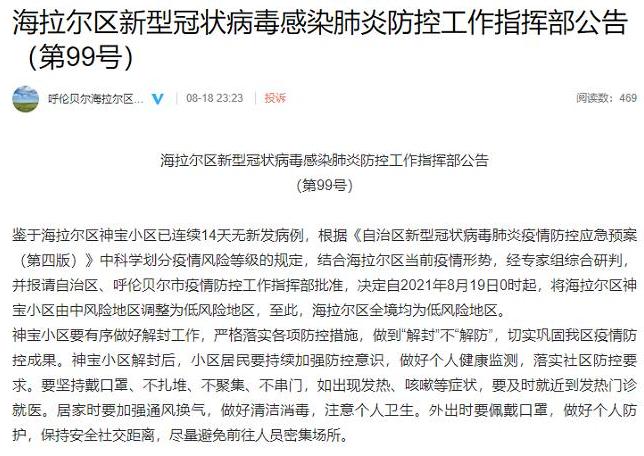 据呼伦贝尔海拉尔区发布消息,鉴于海拉尔区神宝小区已连续14天无新发病例,根据《自治区新型冠状病毒肺炎疫情防控应急预案(第四版)》中科学划分疫情风险等级的规定,结合海拉尔区当前疫情形势,经专家组综合研判,并报请自治区、呼伦贝尔市疫情防控工作指挥部批准,决定自2021年8月19日0时起,将海拉尔区神宝小区由中风险地区调整为低风险地区,至此,海拉尔区全境均为低风险地区。