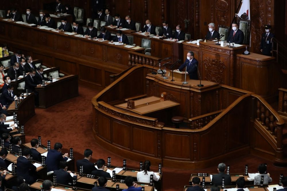 2020年10月26日,日本首相菅义伟在东京召开的第203届临时国会上发表施政演说。(新华社记者杜潇逸摄)