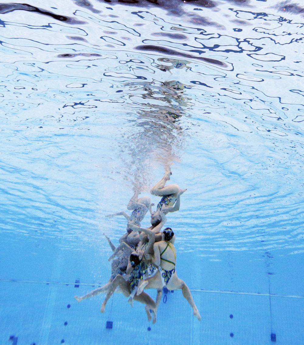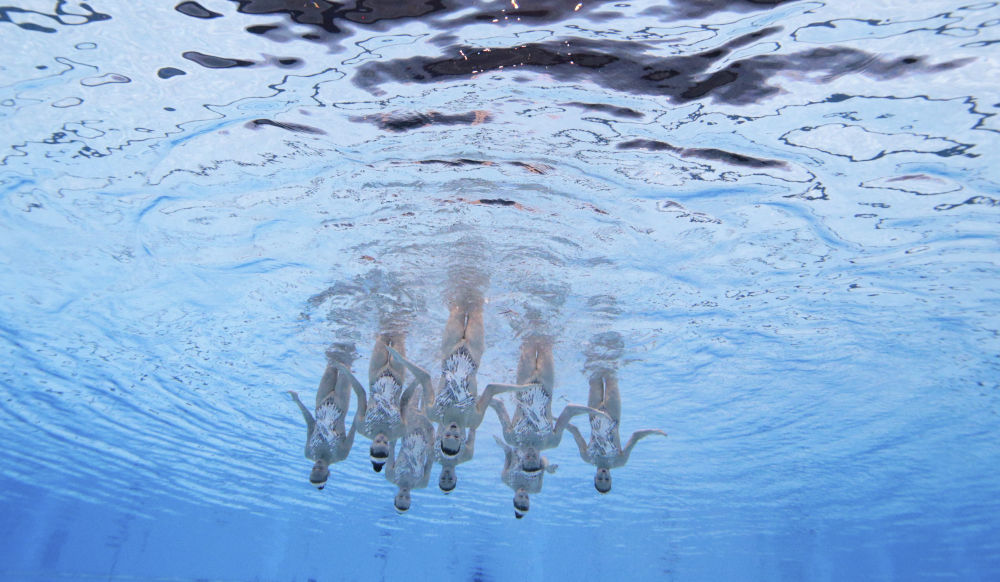 8月6日,乌克兰队在东京奥运会花样游泳集体技术自选比赛中。