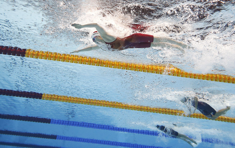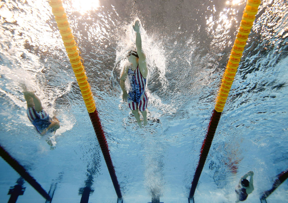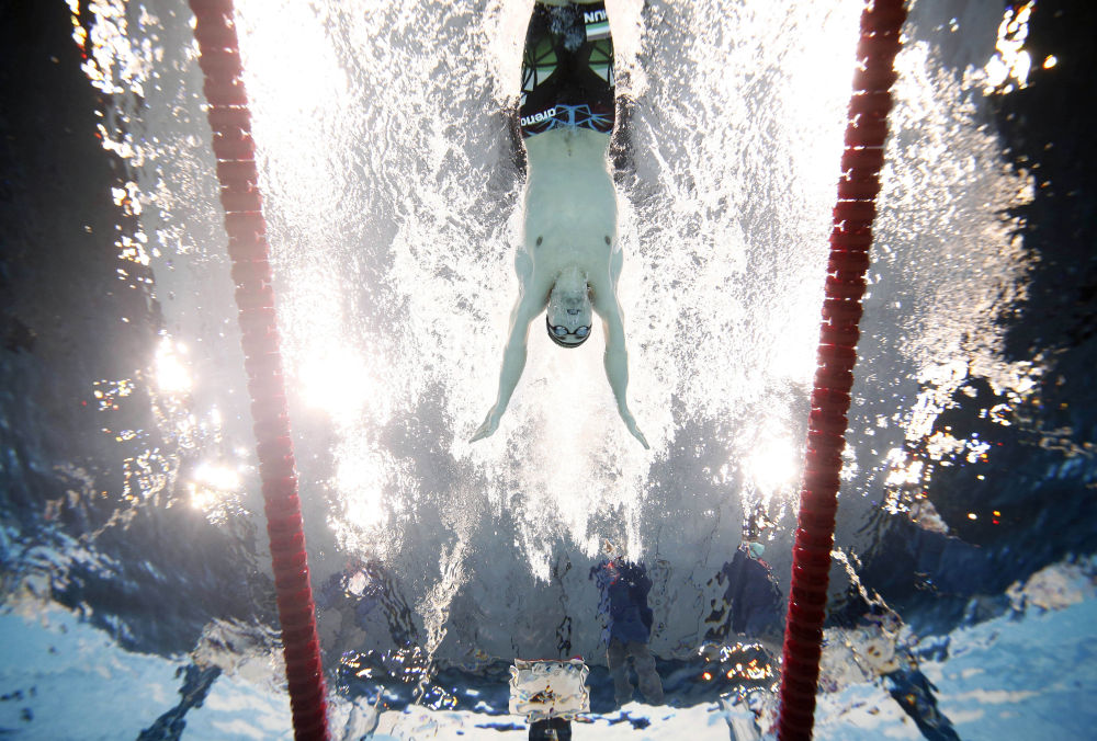 7月27日,美国选手莱德茨基在东京奥运会女子200米自由泳半决赛中入水。