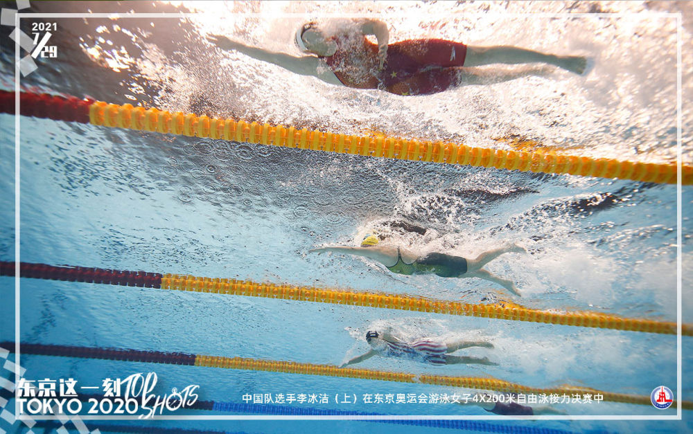 7月29日,中国队第四棒选手李冰洁(上)在比赛中。当日,在东京奥运会游泳女子4X200米自由泳接力决赛中,由杨浚瑄、汤慕涵、张雨霏、李冰洁组成的中国队打破世界纪录并夺冠。
