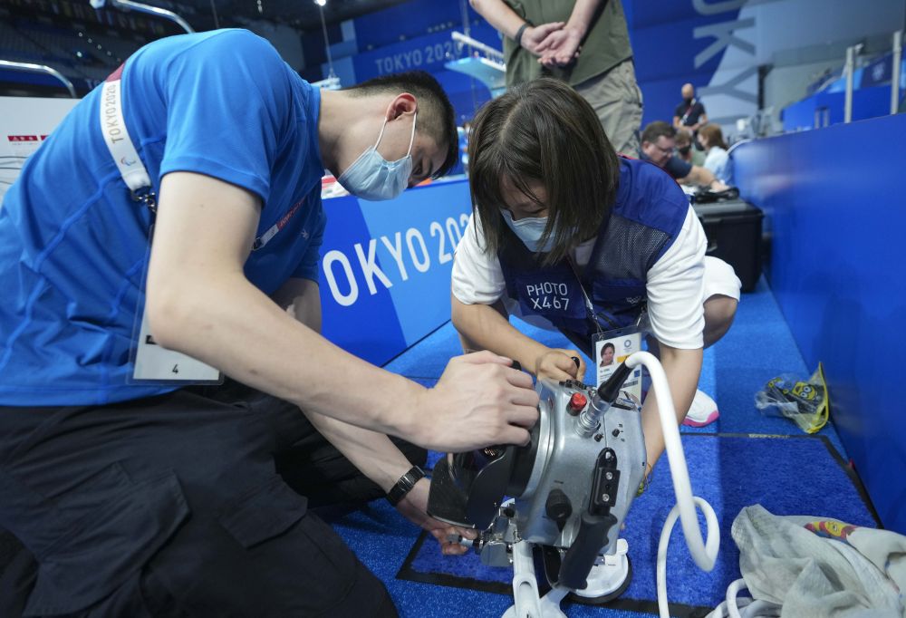 新华社记者丁旭在游泳馆记者工作间里调试水下器材。夏一方 摄