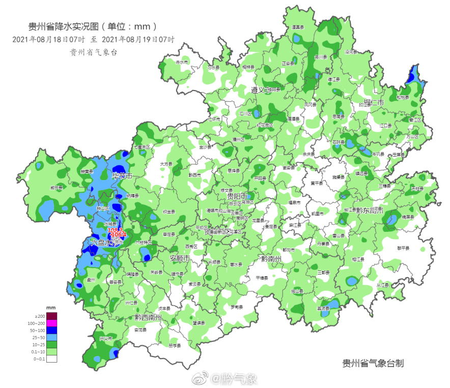 据贵州省气象台监测统计,8月18日8时至19日8时,贵州省水城区域内出现3个观测站大暴雨(米箩108.3毫米、营发106.4毫米、枫香105.3毫米),暴雨出现在六枝、水城 、盘州、钟山、纳雍、七星关、松桃、兴义、石阡、赫章、关岭等11县域内的50个观测站,大雨出现在156个观测站。大雨以上降雨主要在毕节市西部、六盘水市、黔西南州西部。此外,18日夜间到早晨,贵州省有7站出现大雾或低能见度天气;其中务川、万山、锦屏和荔波能见度不足200米。