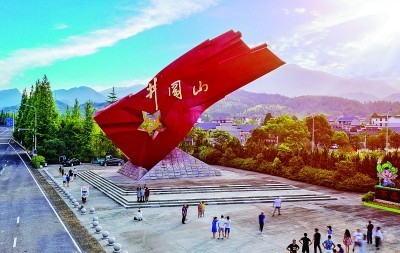 游客在井冈山“井冈红旗”雕塑前参观、拍照。资料图片