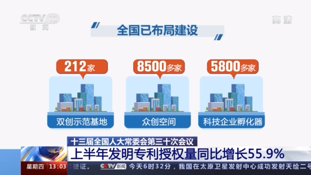 在昨天(18日)召开的十三届全国人大常委会第三十次会议上,根据今年以来国民经济和社会发展计划执行情况报告显示,上半年,我国着力提升科技创新能力,产业结构持续优化,创新创业创造推动新动能蓬勃发展。
