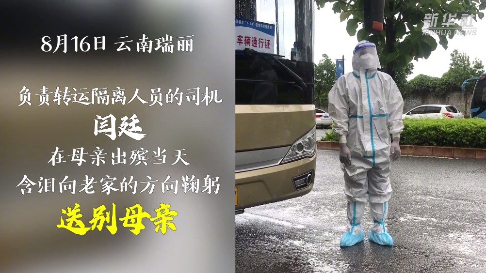 【#抗疫司机含泪向老家方向鞠躬送别母亲#】8月16日,是云南瑞丽负责转运隔离人员的司机闫廷的母亲出殡的日子。由于请假回家奔丧也需要就地接受隔离,闫师傅选择坚守,忍着心中悲痛,含泪向老家方向鞠躬送别母亲。自瑞丽七月初发生疫情以来,闫师傅已安全转运数百位隔离人员。(记者周磊、姚兵、周庚虎) 新华社的微博视频