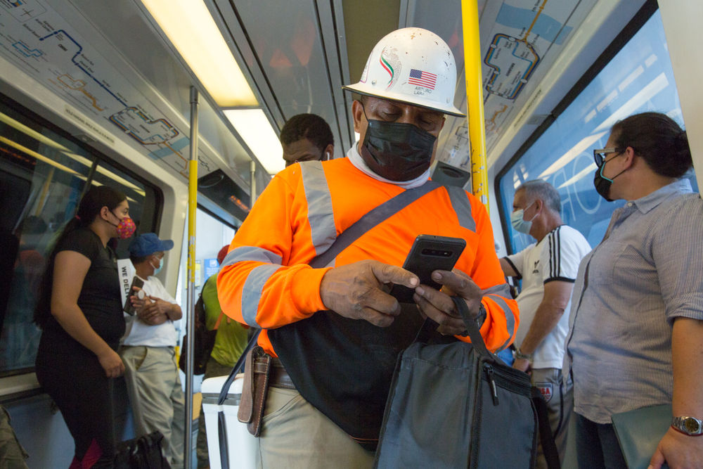 8月11日,在美国佛罗里达州迈阿密,一名戴口罩的男子在地铁上查看手机。(新华社发,莫妮卡·麦克盖文摄)