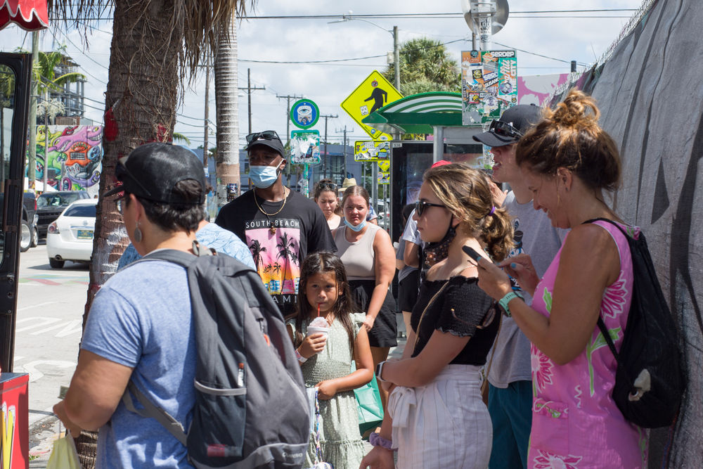 8月11日,人们在美国佛罗里达州迈阿密街头排队购买冷饮。(新华社发,莫妮卡·麦克盖文摄)