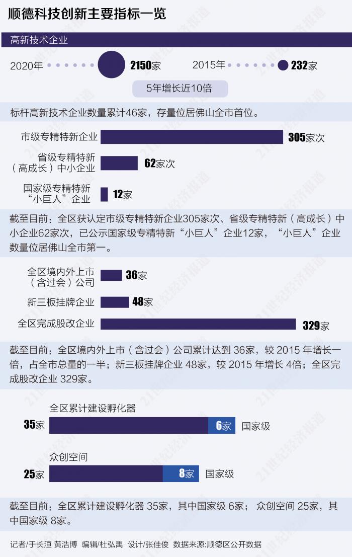 近年,顺德区通过对一批拥有核心技术、成长性好、发展潜力大的企业精准培育,已有效推动高新技术企业实现量与质的跨越式发展:高企存量从2015年的232家预计增长到2020年的2150家,“十三五”期间增长近10倍;标杆高企存量46家,居佛山首位。此外,一场轰轰烈烈的“村改”,腾出了大量连片的产业空间,成为顺德承载产业新动能、重塑竞争力的重要支撑。通过“村改”,顺德抢先下好创新驱动发展“先手棋”,也为“村改后半篇文章”谋篇布局,积极为广东探索高质量发展的“顺德示范”。
