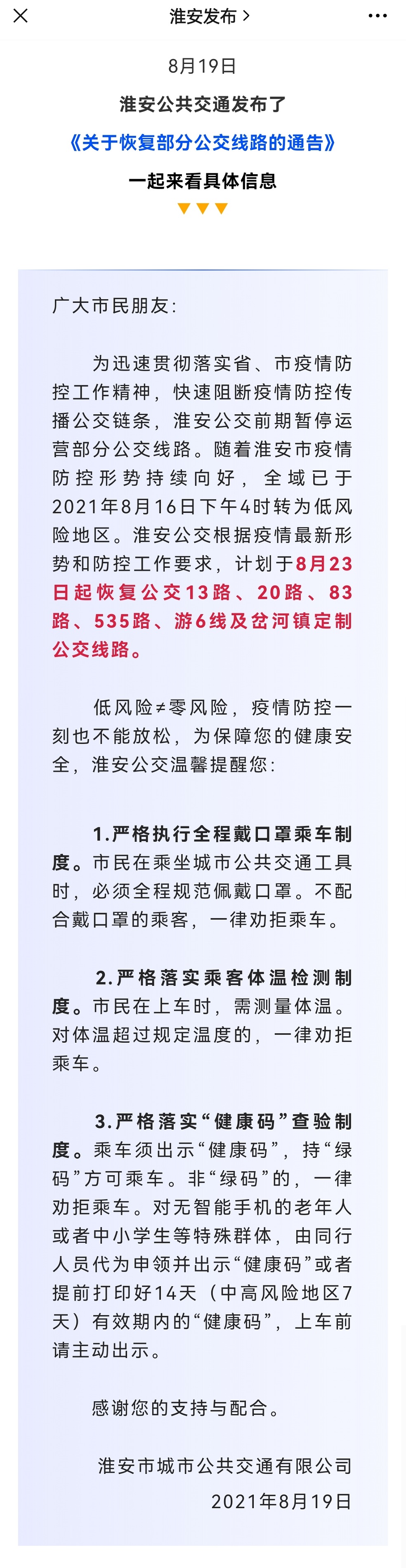 江苏淮安公共交通今天发布《关于恢复部分公交线路的通告》:为迅速贯彻落实省、市疫情防控工作精神,快速阻断疫情防控传播公交链条,淮安公交前期暂停运营部分公交线路。随着淮安市疫情防控形势持续向好,全域已于2021年8月16日下午4时转为低风险地区。淮安公交根据疫情最新形势和防控工作要求,计划于8月23日起恢复公交13路、20路、83路、535路、游6线及岔河镇定制公交线路。