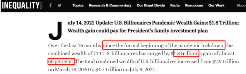 △非营利组织“INEQUALITY”网站:从去年3月到今年7月,美国713位亿万富豪的资产总和增加了1.8万亿美元,达4.7万亿,涨幅接近60%。