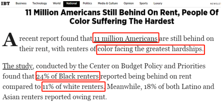 △《国际财经时报》(IBT)网站:近期报告显示,美国仍有1100多万成年人无力按时缴纳房租,少数族裔面临的困难尤甚,有24%的黑人租户拖欠租金,而白人租户拖欠租金的比例仅为11%。