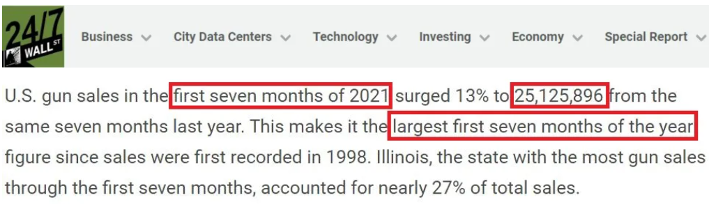 美媒发布的最新数据显示,今年仅前7个月,美国枪支销量就已超过2500万支,创下1998年有记录以来的同期最大销量。