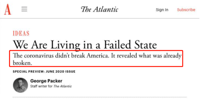 正如《大西洋月刊》早前刊文指出的那样,“我们生活在一个失败的国家“,“新冠病毒没有撕裂美国,只是暴露了美国已有的撕裂”。