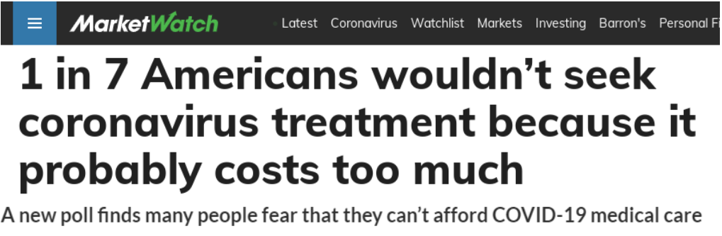 没有保险就看不起病,成了疫情下底层民众命运的真实写照。盖洛普民调发现,美国平均每7个人中就有1人因无力支付高额医疗费用,即使感染了新冠病毒也不敢就医。