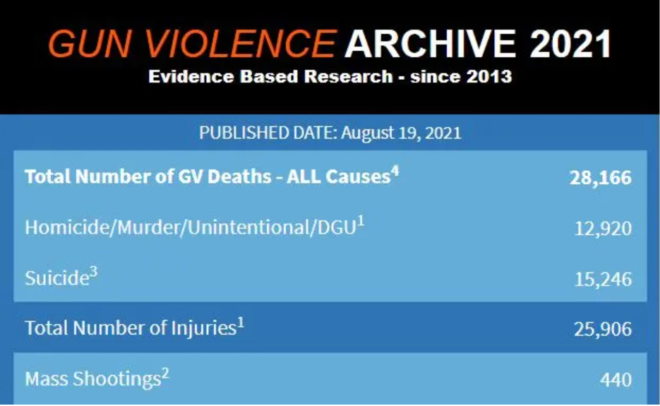 而“人人有枪”的结果就是枪祸的横行。美国“枪支暴力档案”(GVA)网站最新统计显示,截至当地时间19日,今年全美(不包括自杀在内的)各类枪支暴力事件已导致12920人丧生;造成四人以上伤亡的大规模枪击案已发生440起。
