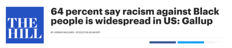 由于党争不休,时至今日,在是否承认美国存在种族主义、是否应采取措施应对种族主义等问题上,美国的社会撕裂丝毫未见弥合,近期的一项盖洛普民调显示,64%的美国人认为美国普遍存在针对黑人的种族歧视。