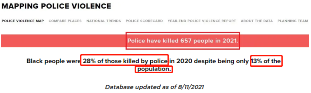 据美国“警察暴力地图”(MPV)网站统计,2020年美国警察共开枪打死1127人,只占美国总人口13%的黑人占到了被警察枪杀人数的28%。今年截至目前的最新数据显示,美国警察已经杀死657人,黑人占比仍远高于其占美国总人口比例。