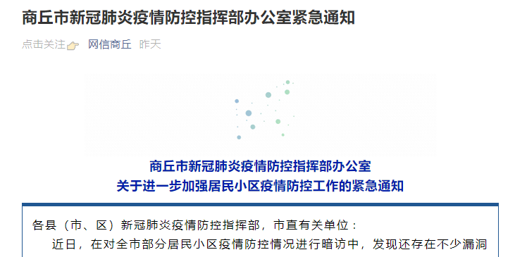 据“网信商丘”消息,河南省商丘市新冠肺炎疫情防控指挥部办公室发布《关于进一步加强居民小区疫情防控工作的紧急通知》,全文如下: