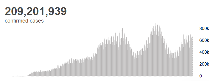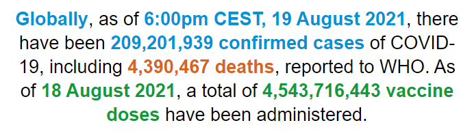 根据世卫组织最新实时统计数据,截至欧洲中部夏令时间8月19日18时(北京时间8月20日0时),全球累计新冠肺炎确诊病例209201939例,累计死亡病例4390467例。