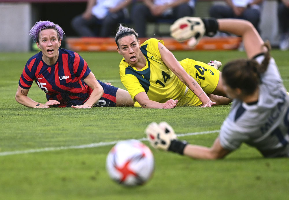 8月5日,美国队球员拉皮诺(左)和澳大利亚队球员肯尼迪(中)在拼抢倒地后,紧盯滚动的足球。