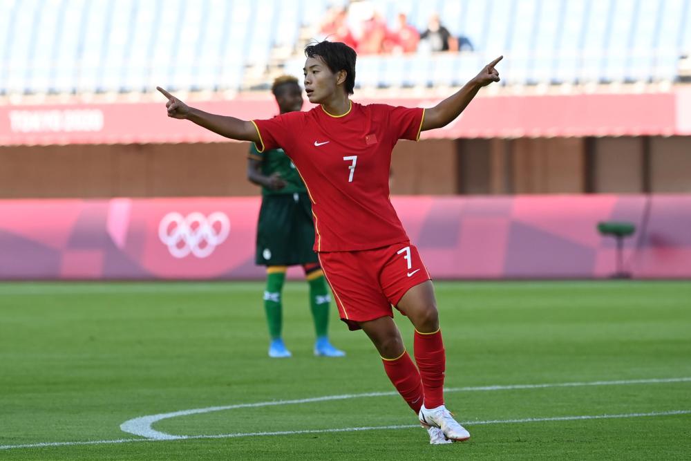 7月24日,中国队在东京奥运会女足小组赛F组比赛中战平赞比亚队。这是王霜进球后庆祝。