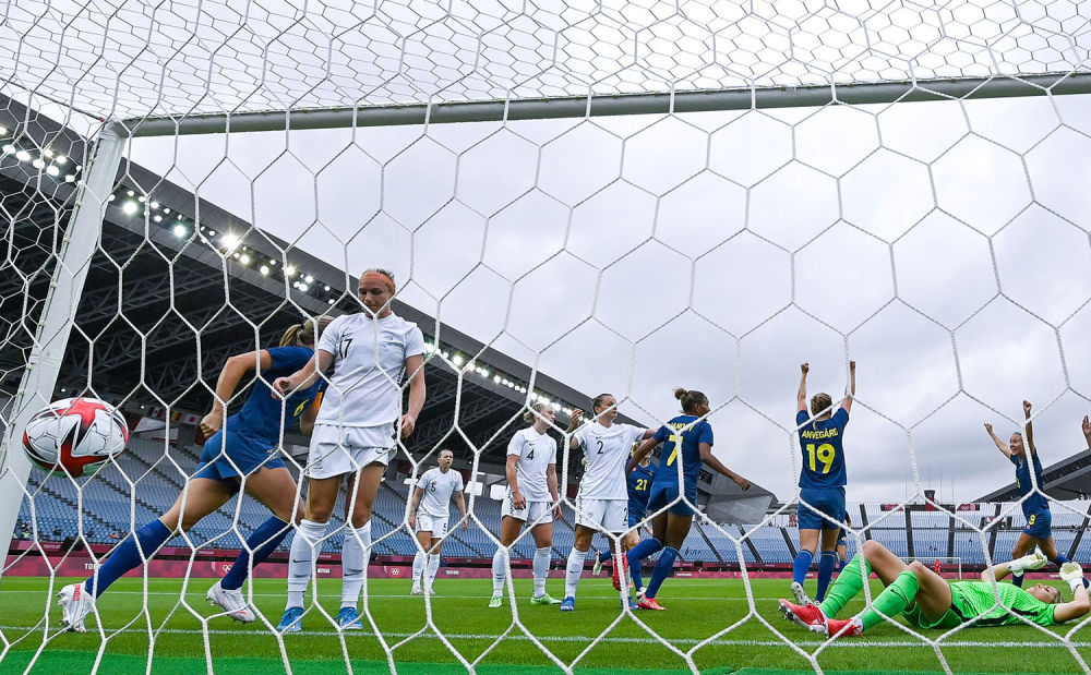 7月27日,在东京奥运会女足小组赛G组瑞典对阵新西兰的比赛中,瑞典队球员安娜·安维嘉(右三)进球。