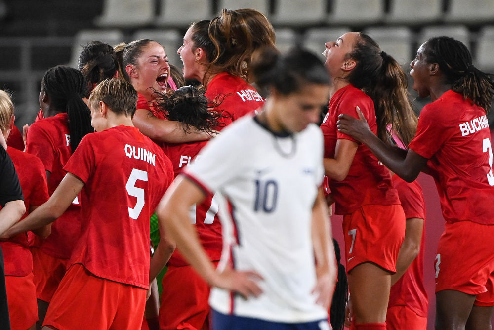 8月2日,加拿大队球员庆祝在女子足球半决赛中战胜美国队。