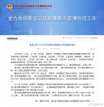 截至8月19日24时,据31个省(自治区、直辖市)和新疆生产建设兵团报告,现有确诊病例1817例(其中重症病例54例),累计治愈出院病例88126例,累计死亡病例4636例,累计报告确诊病例94579例,现有疑似病例4例。累计追踪到密切接触者1155346人,尚在医学观察的密切接触者40859人。