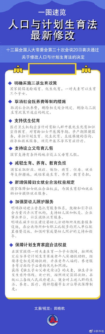 【一图速览 | #人口计生法的最新修改#】十三届全国人大常委会第三十次会议20日表决通过了关于修改人口与计划生育法的决定。人口计生法自2002年施行以来,于2015年实施全面两孩政策时进行了修改。为优化生育政策、促进人口长期均衡发展,此次对这部法律作出了哪些重要修改?戳图速览↓