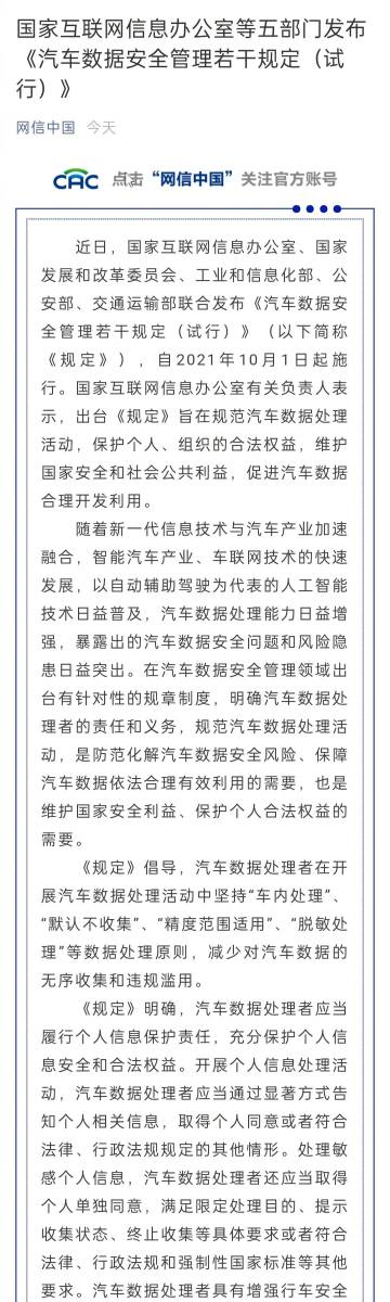 【国家网信办等五部门发布《#汽车数据安全管理若干规定(试行)#》:#促进汽车数据合理开发利用#】记者20日从国家网信办获悉,国家网信办、公安部等五部门近日联合发布《汽车数据安全管理若干规定(试行)》,自10月1日起施行。规定倡导,汽车数据处理者在开展汽车数据处理活动中坚持“车内处理”“默认不收集”“精度范围适用”“脱敏处理”等原则,减少对汽车数据的无序收集和违规滥用。规定明确,汽车数据处理者应当履行个人信息保护责任,充分保护个人信息安全和合法权益。规定强调,因业务需要确需向境外提供重要数据的,汽车数据处理者应当落实数据出境安全评估制度要求,不得超出出境安全评估结论违规向境外提供重要数据,并在年度报告中补充报告相关情况。据介绍,对于违反本规定的汽车数据处理者,有关部门将依照《中华人民共和国网络安全法》《中华人民共和国数据安全法》等法律、行政法规的规定进行处罚。(记者余俊杰)