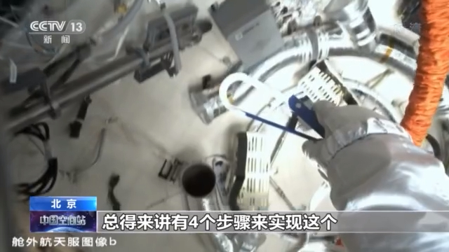 航天科技集团五院空间站热控分系统副主任设计师 黄磊:总得来讲有4个步骤来实现扩展泵组的安装,我们也把它总结成了4个口诀叫:一钩、二锁、三通、四连。