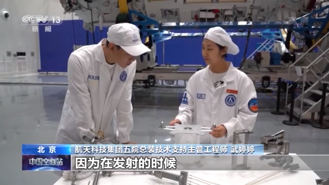 航天科技集团五院总装技术支持主管工程师 武婷婷:这个就是我们的全景相机抬升支架,发射的时候,我们的全景相机因为有包络限制,所以它的位置是比较低的。因此在航天员第一次出舱的时候,就需要把全景相机抬升,就需要用到我们全景相机支架,把支架安装到舱体上,然后再把全景相机安装在支架上。