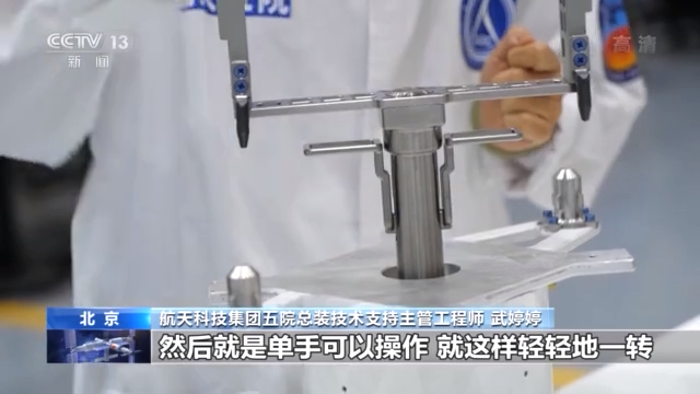航天科技集团五院总装技术支持主管工程师 武婷婷:全景相机支架上面有三个接口,就是跟通用把手配合使用的。通用把手主要就是对我们舱外的这些维修设备、维修工具,都是可以对他们进行转移和防飘的功能。航天员只要抓着这个把手,单手可以操作,轻轻一转,按一下二次锁定,这时候就是一个稳固的连接,不会脱出。