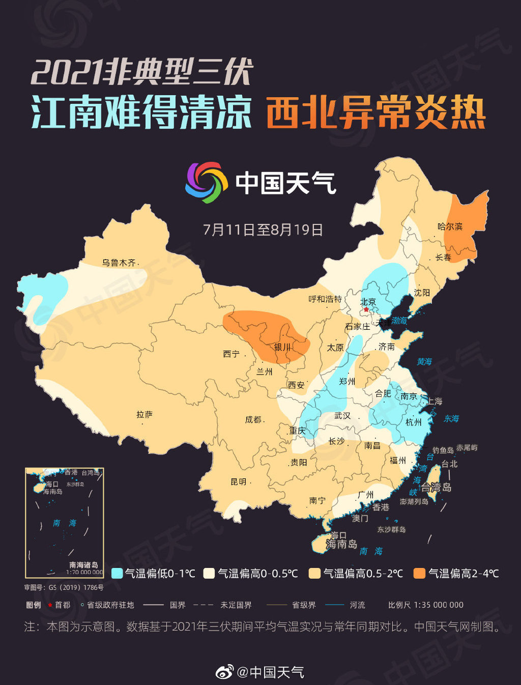 ①今年三伏期间江南一带是难得的清凉,尤其是浙江、安徽南部等地。西北地区今年三伏期间异常偏热,兰州三伏期间共11个高温日。#三伏江南难得清凉#