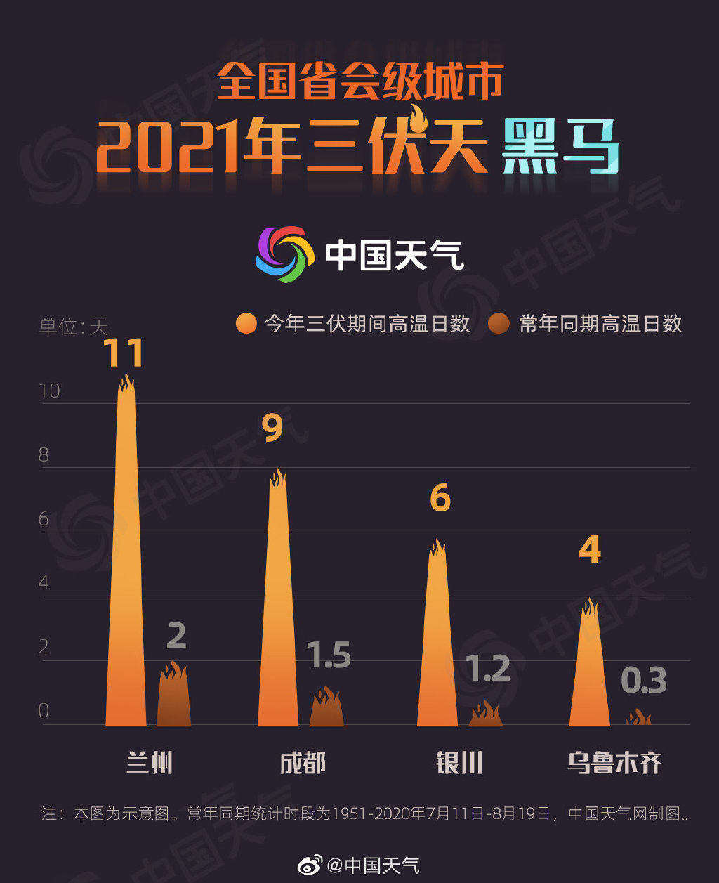 今年三伏高温黑马榜上,兰州、成都、银川、乌鲁木齐排行前四。