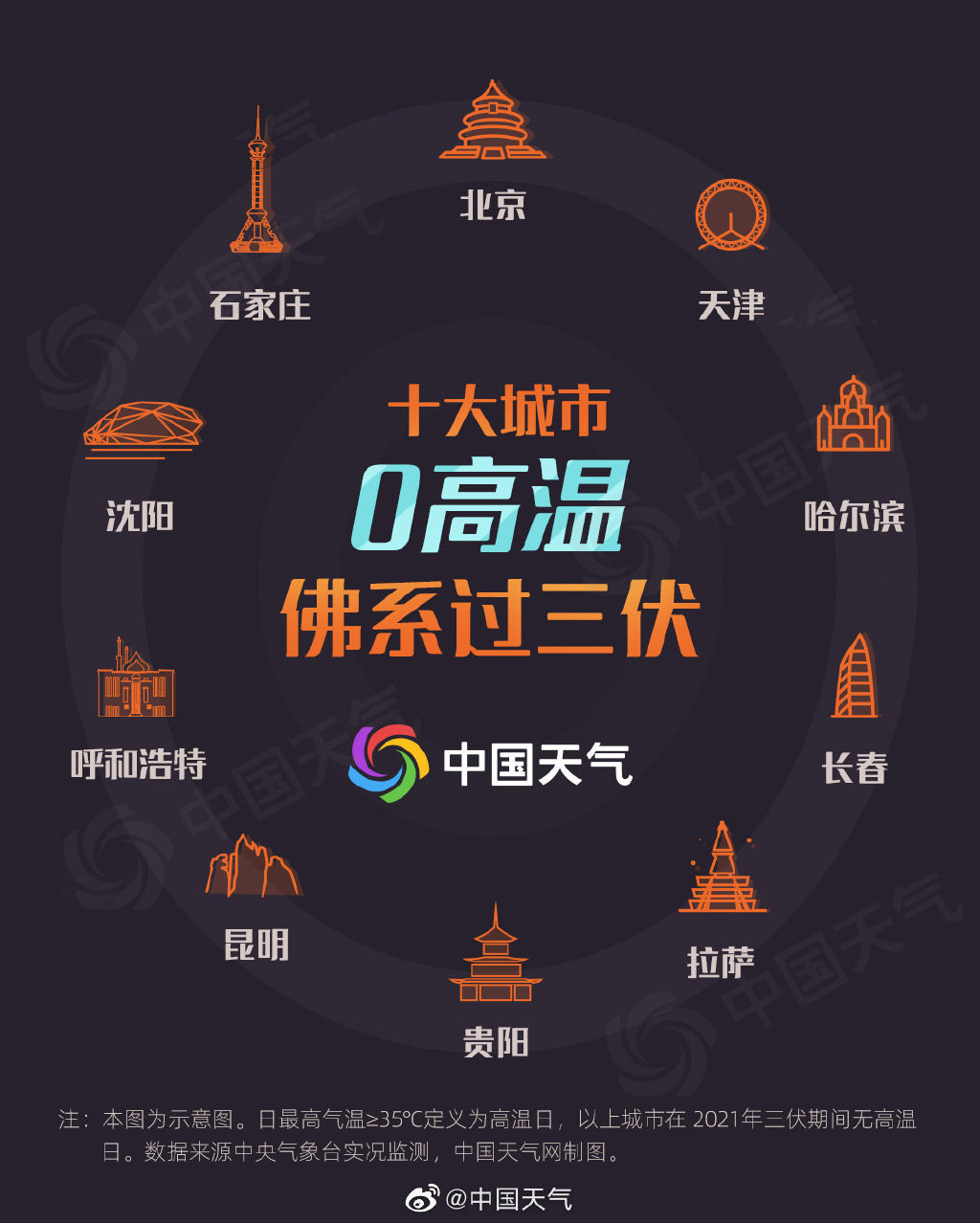 ②北京、天津、石家庄、呼和浩特、哈尔滨、长春、沈阳、贵阳、昆明、拉萨十大城市没有出现35℃及以上的高温天气。#10省会级城市三伏无高温#