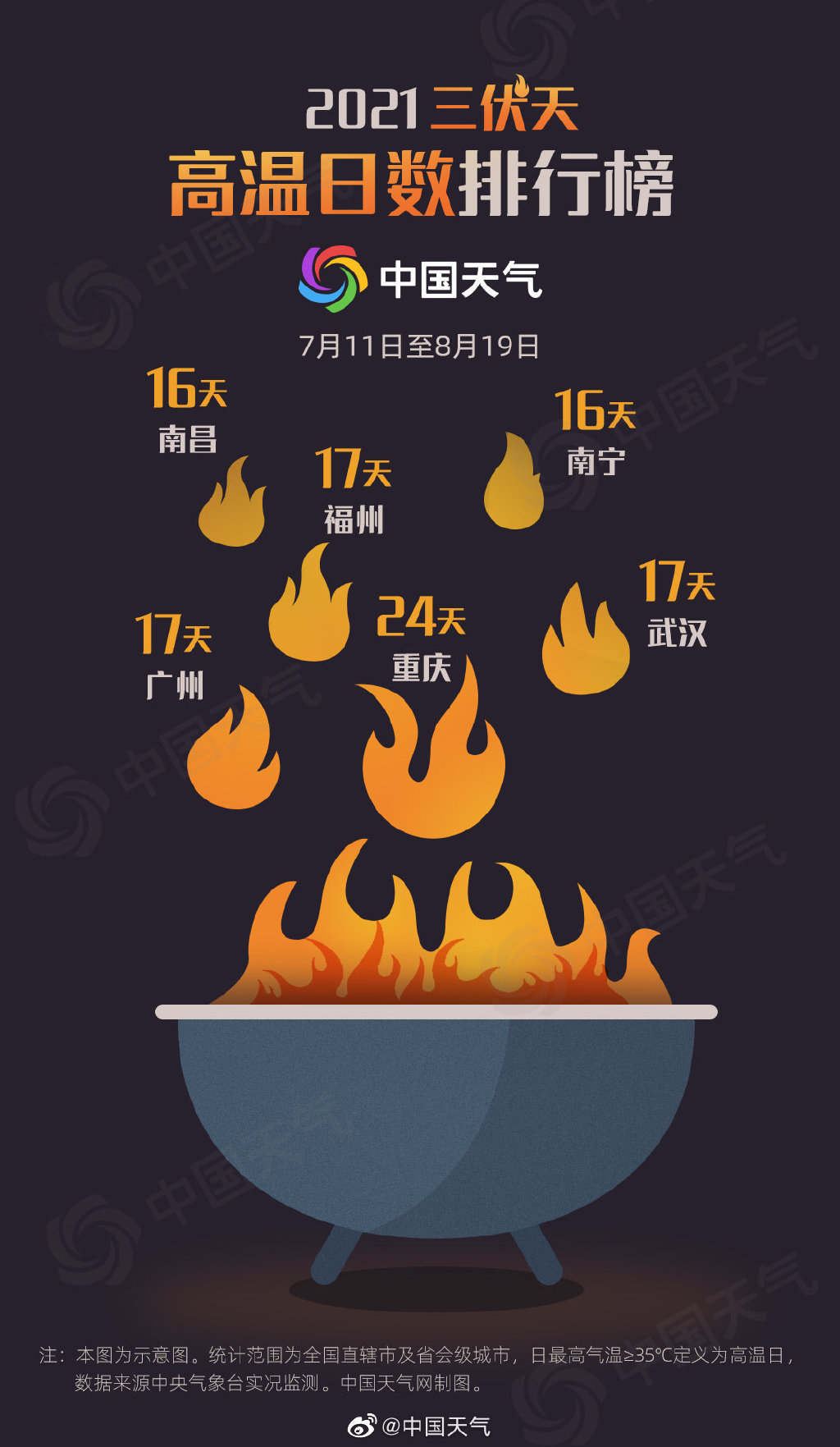 ③大城市高温排行榜上来看,重庆一骑绝尘,以40天里有24天高温占据榜首。并列第二的是广州、福州、武汉,紧随其后的是南昌和南宁。
