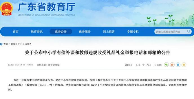 8月11日,广东省教育厅设立了中小学有偿补课和教师违规收受礼品礼金举报电话和邮箱,受理相关举报投诉。