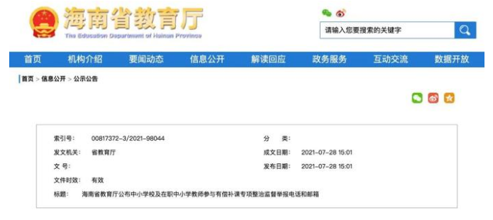 7月28日,为畅通举报渠道,海南省教育厅将省教育厅和各市县(区)教育局、厅直属中学的监督举报电话和邮箱向社会公开。