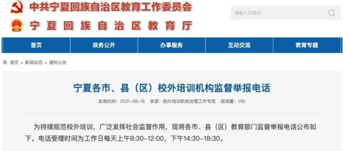 8月16日,为持续规范校外培训,广泛发挥社会监督作用,宁夏回族自治区教育厅将各市、县(区)教育部门监督举报电话公布。