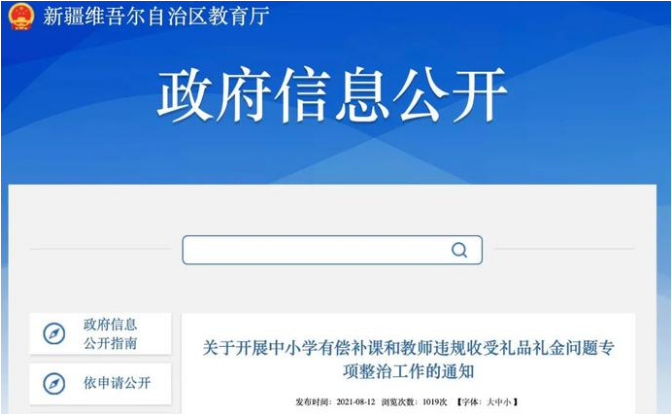 8月12日,新疆维吾尔自治区教育厅公布了关于开展中小学有偿补课和教师违规收受礼品礼金问题专项整治工作的通知,公布了中小学有偿补课和教师违规收受礼金问题举报电话。